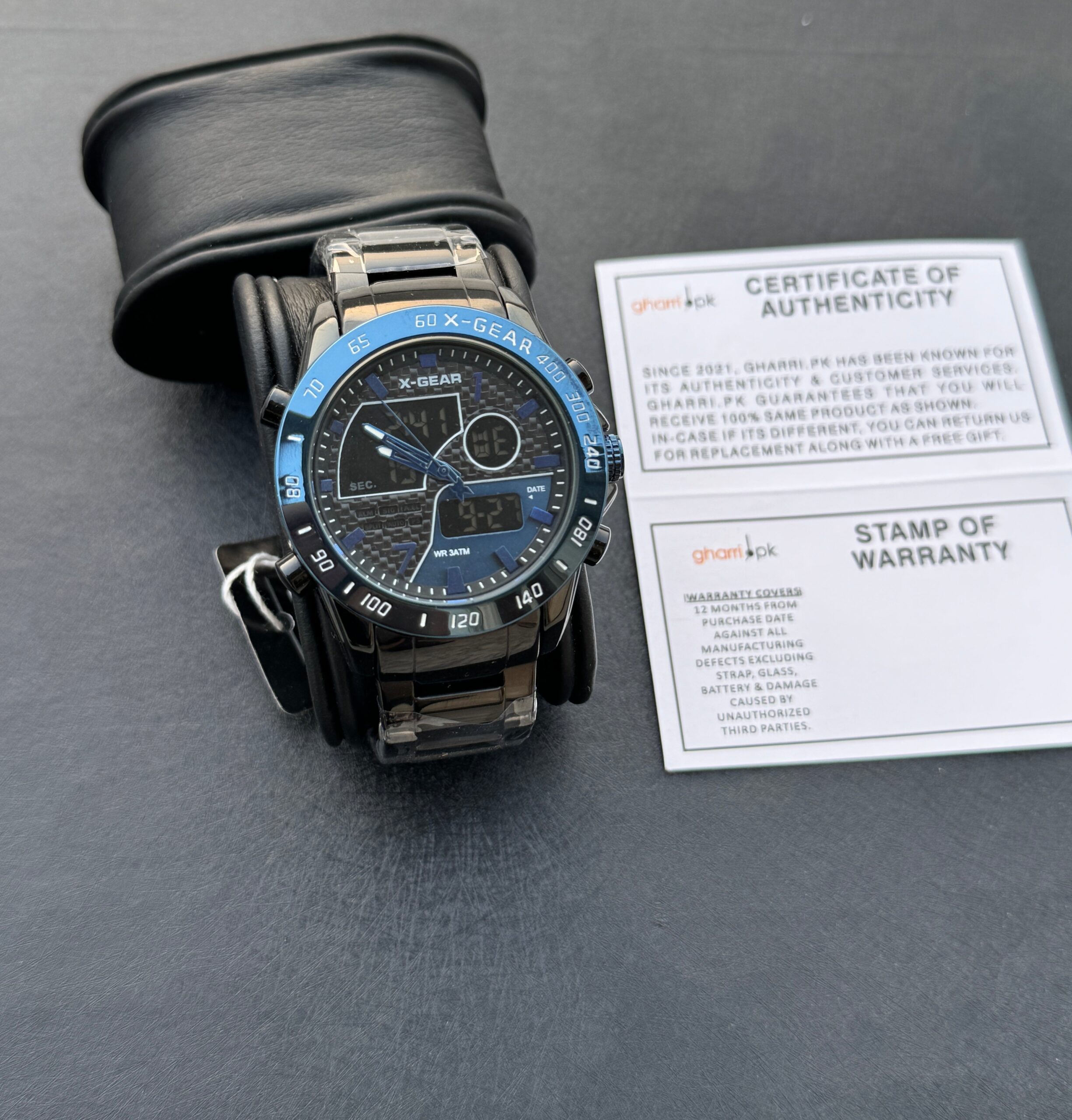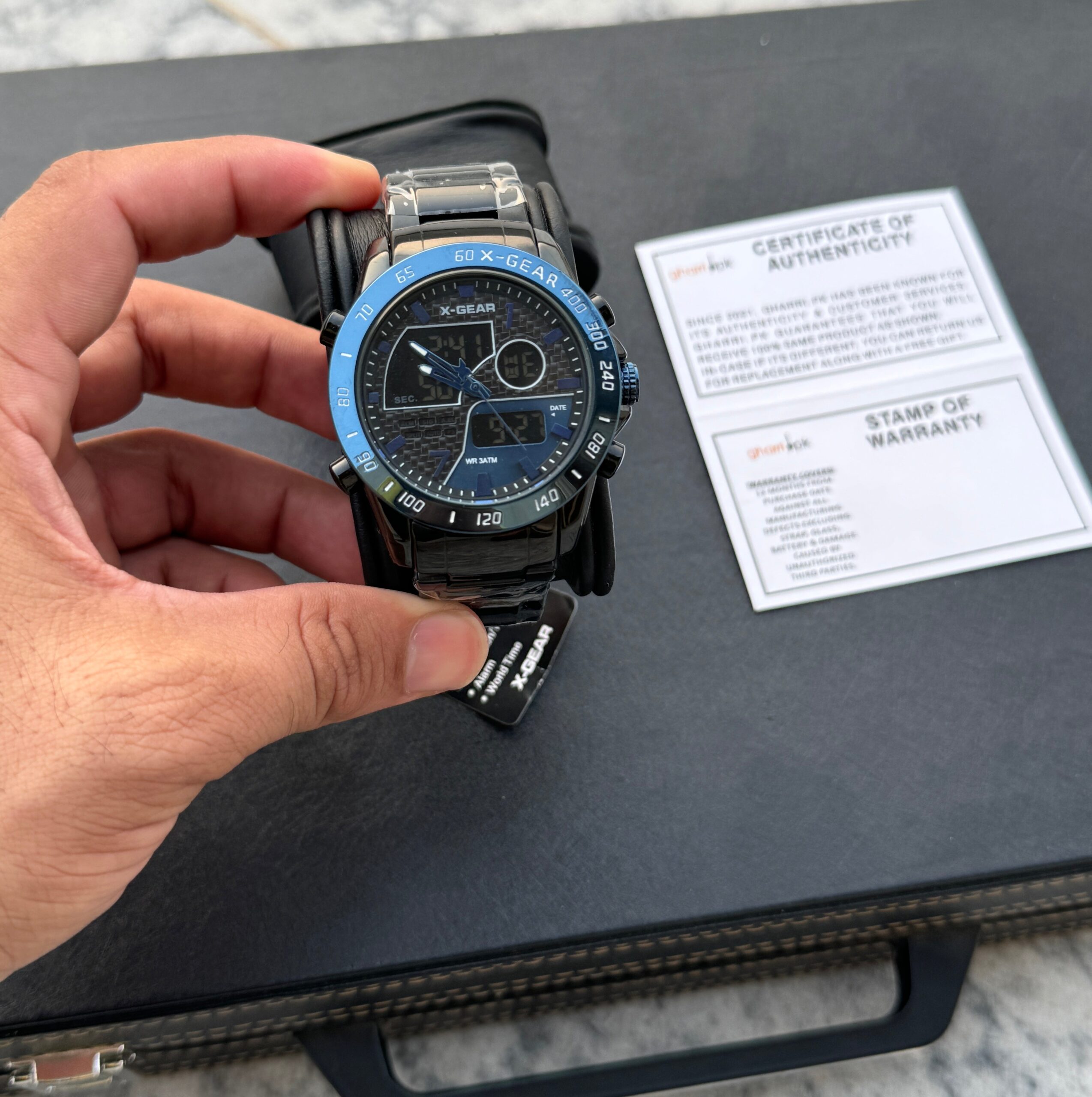 Premium Original X-GEAR Series Official One year Mechanical Warranty Water Resistant 3ATM Lens Material = Mineral Glass (Scratch Resistant) Heavy Weight Watch Series (170+ gm) Special Features All buttons working Digital Day & Date Alarm, Stop watch, LED Light (Fully Functional) Stainless Steel Body & Back Premium durable Colours Premium Solid Machinery Dial Diameter: 45MM