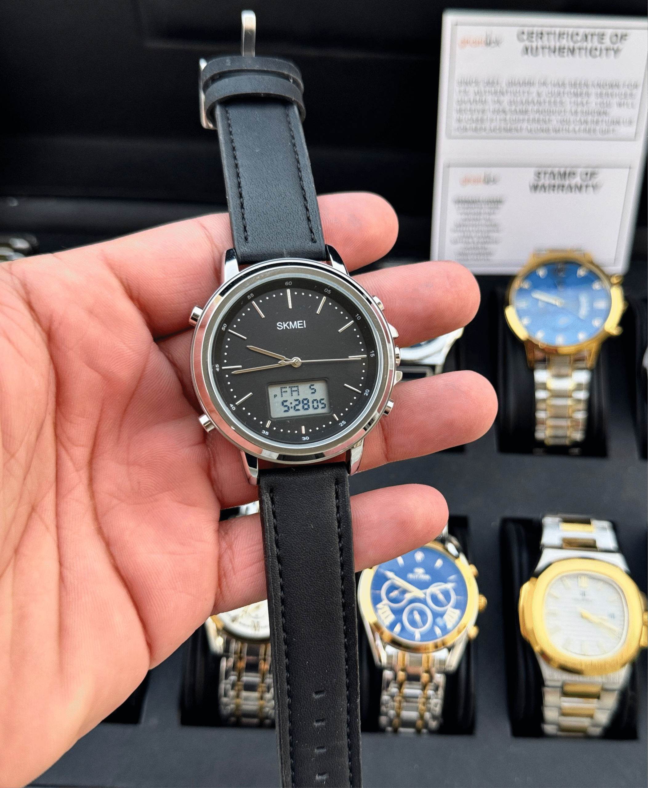 Official One year Mechanical Warranty Dual time All buttons working Stainless Steel Body & Back High Quality Glass Premium Genuine Leather Premium durable Colours Professional Series Water Resistant 3ATM Whats inside box 📦? – One Premium Watch – Official Warranty Card – One Loyality Card